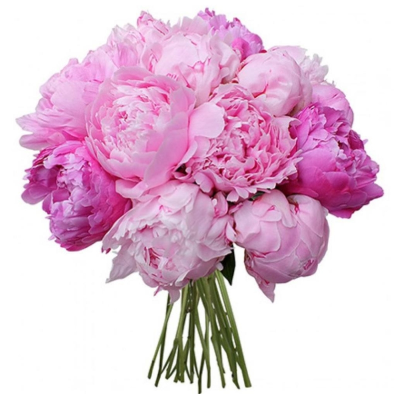 Букет состоит из 15 розовых пионов, прозрачная упаковка, атласная лента.