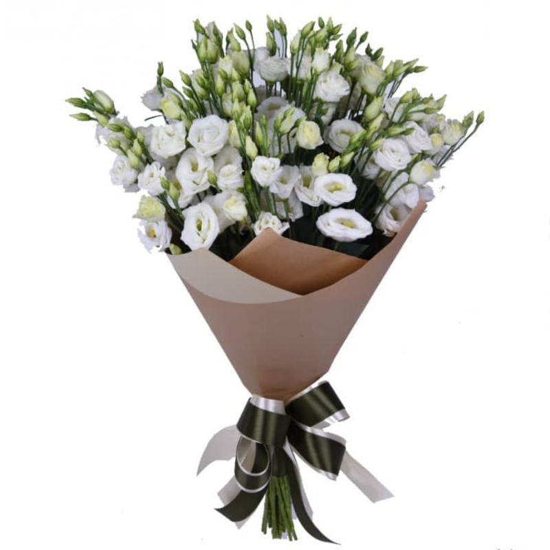 Букет состоит из 17 веток белой и сиреневой эустомы, крафт, атласная лента.
