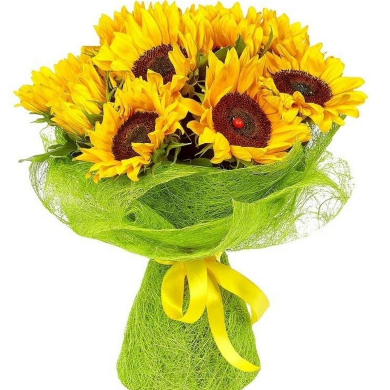 Букет состоит из 11 подсолнухов, салал, упаковка, лента.