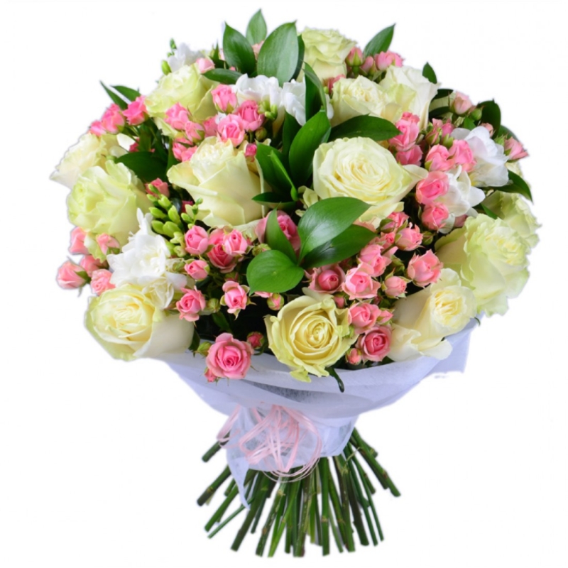 Букет состоит из 15 белых роз, 7 веток кустовых роз, 9 фрезий, зелень, красивая упаковка, атласная лента.