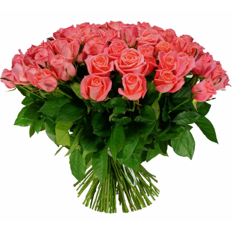 Букет состоит из 55 коралловых роз, прозрачная упаковка, атласная лента.