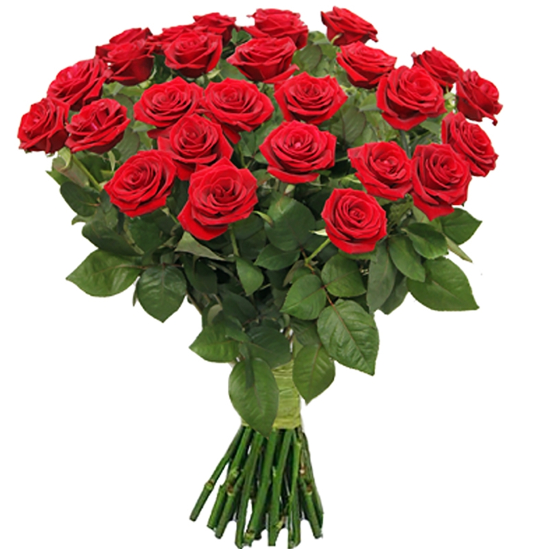Букет состоит из 35 красных роз, прозрачная упаковка, атласная лента.