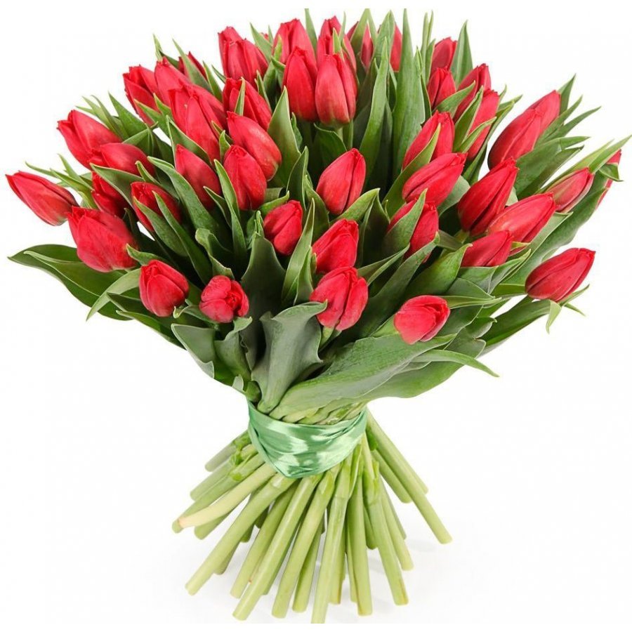 Букет состоит из 51 красный тюльпан, прозрачная упаковка, красная лента.