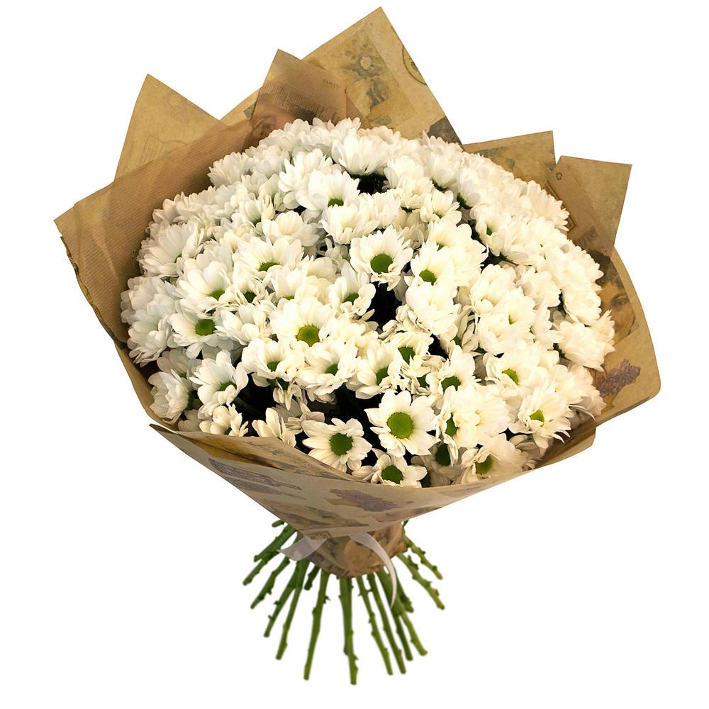 Букет состоит из 15 веток белой ромашковой хризантемы, крафт, атласная лента.