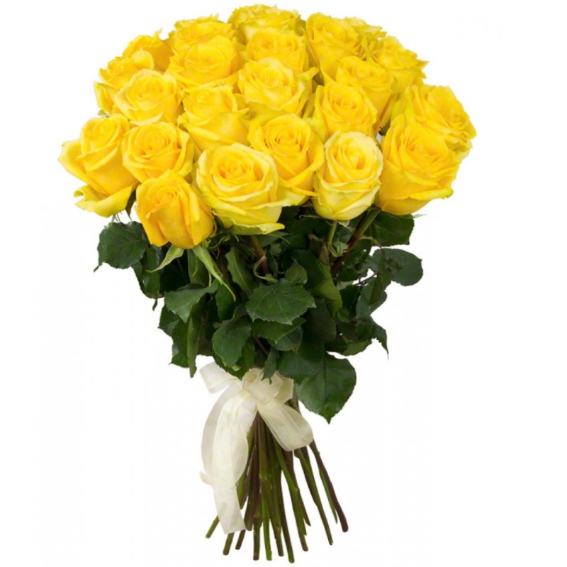 Букет состоит из 25 желтых роз, прозрачная упаковка, атласная лента.